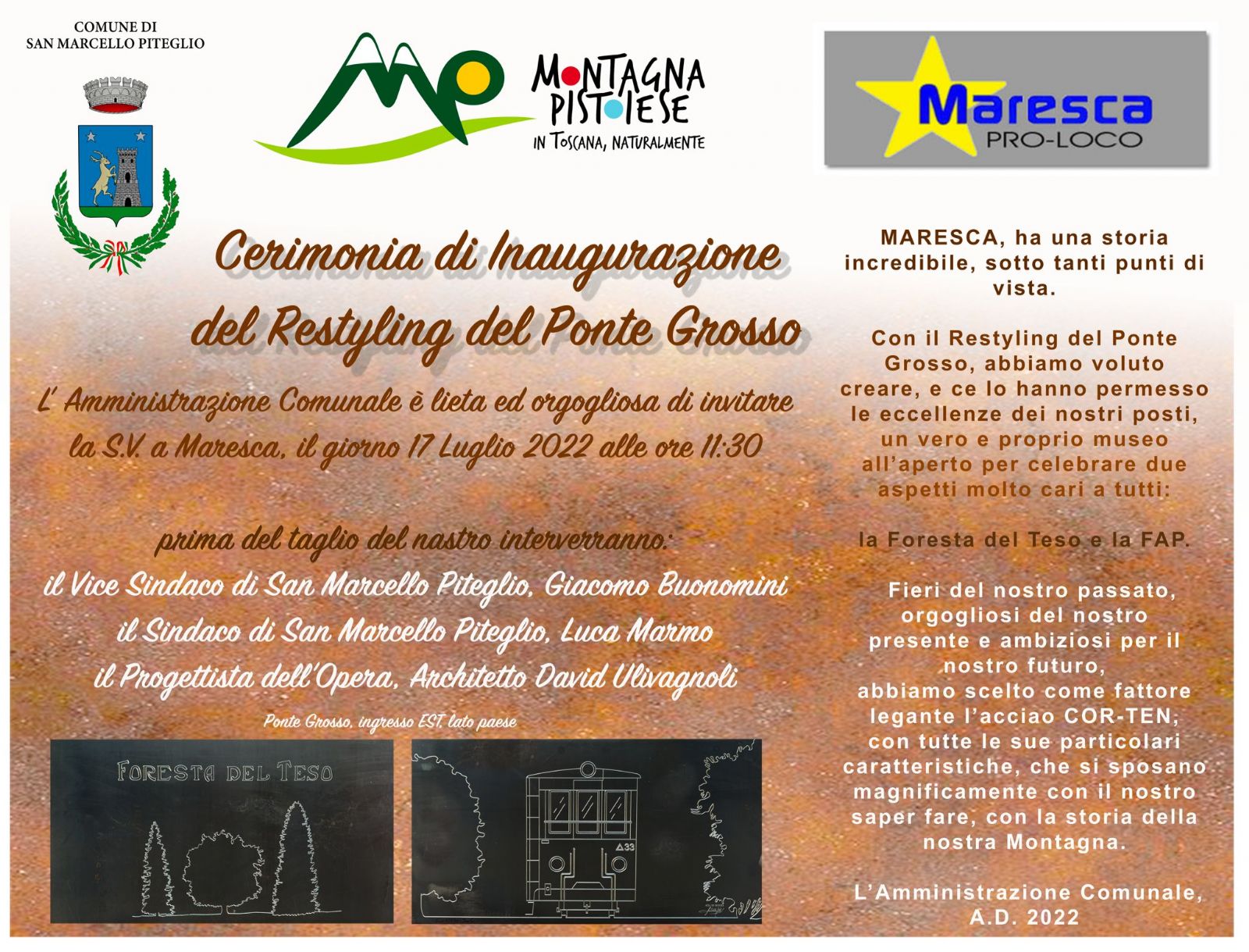Si informa che avrà luogo il giorno domenica 17 luglio 2022 alle ore 11.30 la cerimonia di inaugurazione riapertura del Ponte Grosso FAP a Maresca.