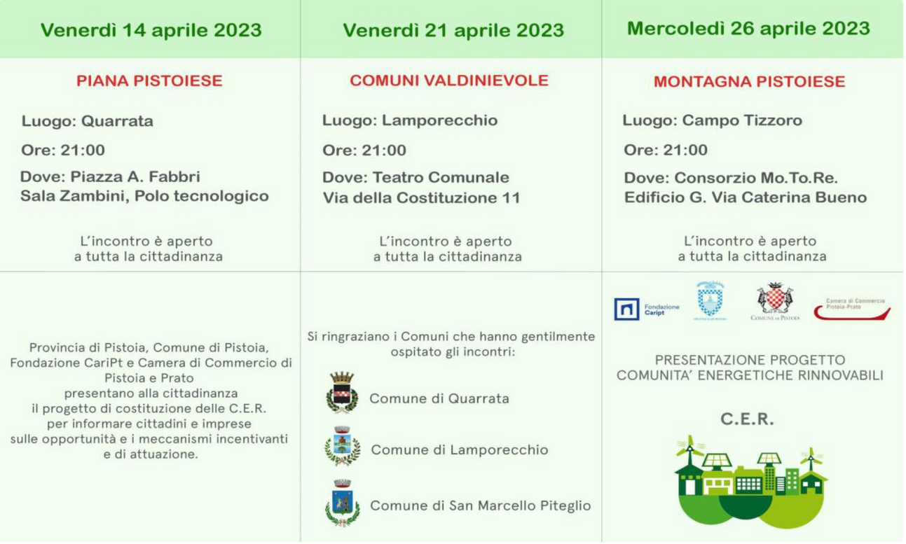 Per informare e coinvolgere cittadini, imprese e stakeholders sulle opportunità ed i meccanismi incentivanti e di attuazione delle CER, si svolgeranno alcune a assemblee pubbliche tra le quali, mercoledì 26 alle ore 21.00 presso il consorzio Mo.To.Re a Campo Tizzoro.