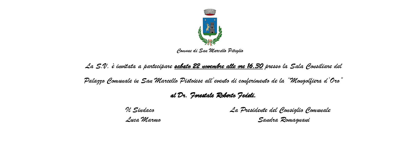 Il giorno 22 novembre alle ore 16.30, nella Sala consiliare del Palazzo Comunale in San Marcello Pistoiese, l’Amministrazione sarà orgogliosa di conferire ufficialmente al dottor Fedeli il riconoscimento de “La Mongolfiera d’Oro” con la seguente motivazione: