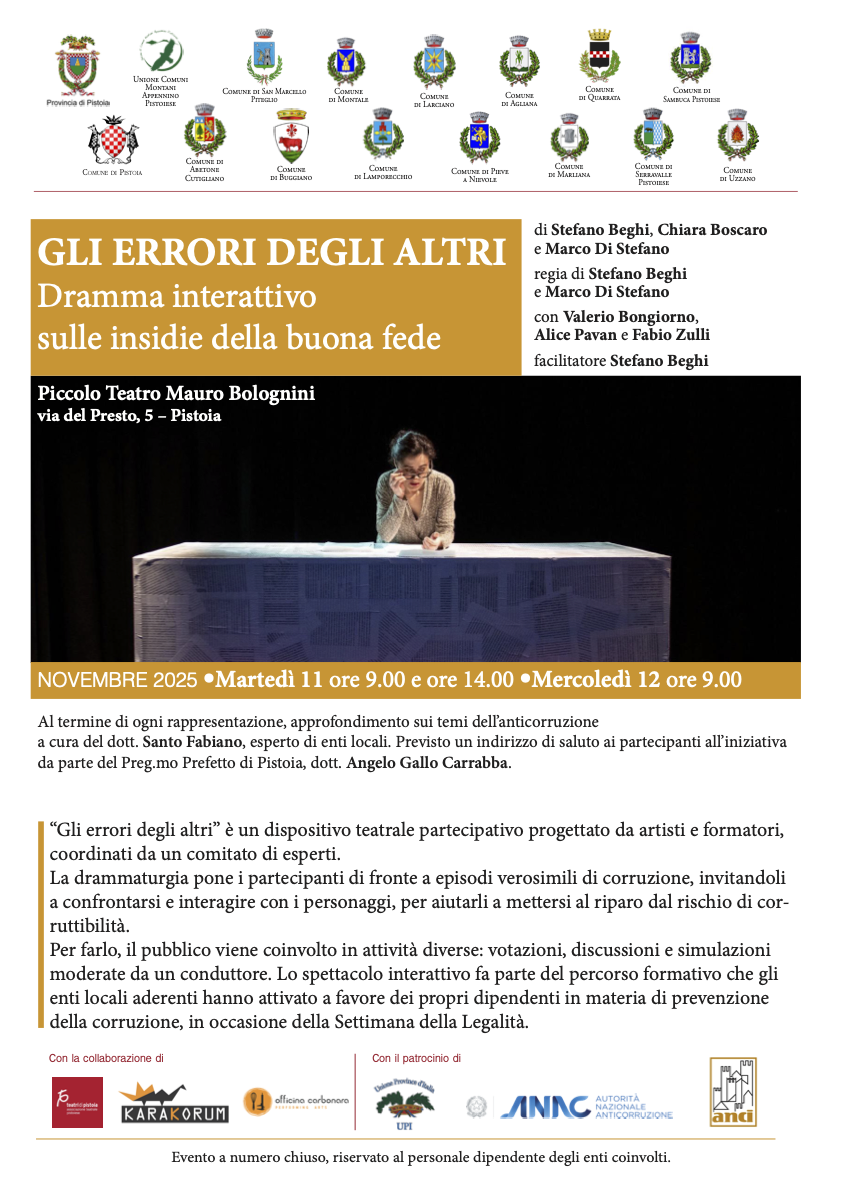L’iniziativa, che si articolerà in tre spettacoli replicati l’11 e 12 novembre 2025, nasce dal lavoro di rete promosso dai Segretari comunali, che per la prima volta si sono coordinati attivamente per mettere in sinergia amministrazioni diverse, condividendo risorse, idee e strumenti di formazione.
