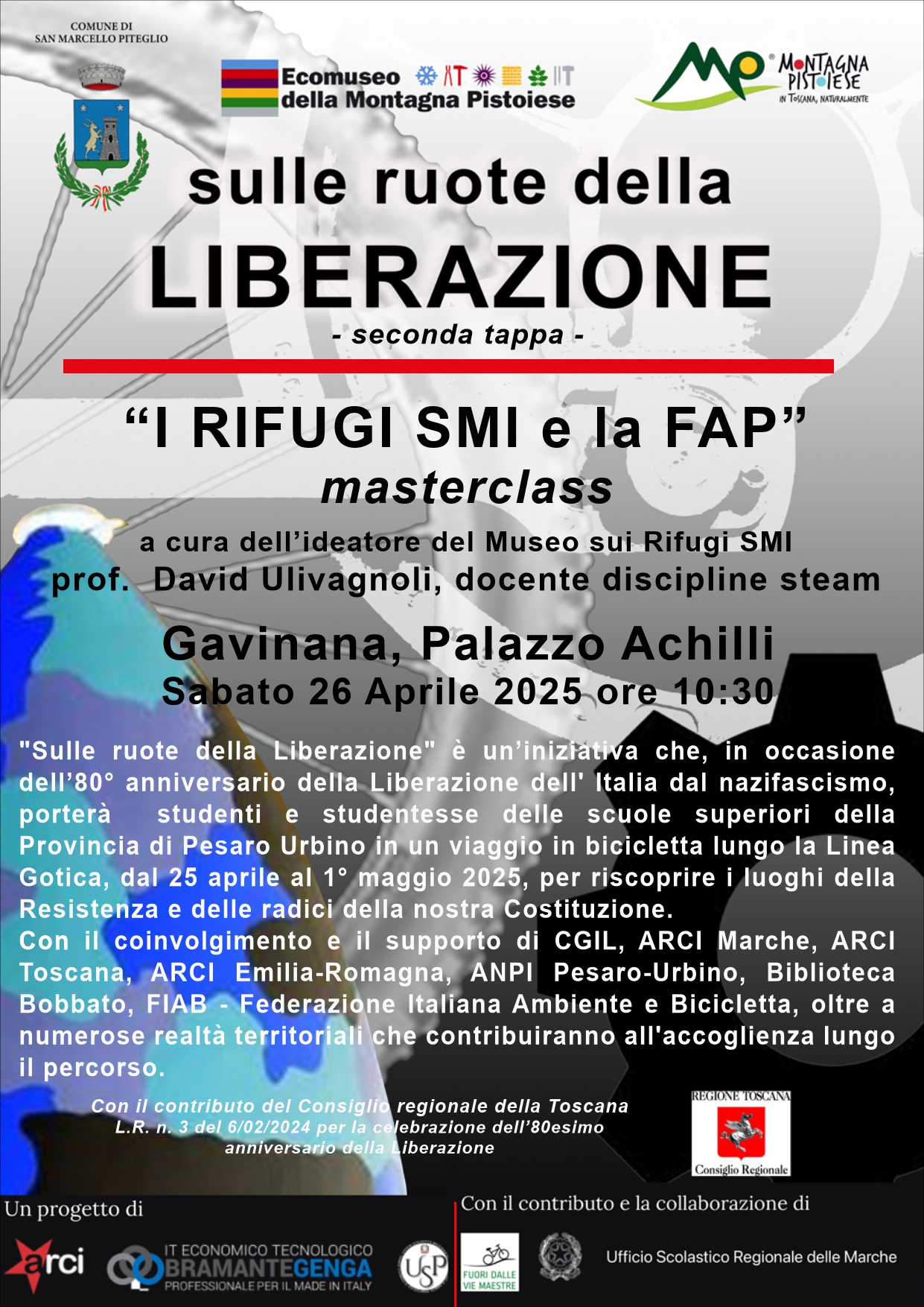 "Sulle ruote della Liberazione" è un'iniziativa che, in occasione dell'80° anniversario della Liberazione dell'Italia dal nazifascismo, porterà studenti e studentesse delle scuole superiori della Provincia di Pesaro Urbino in un viaggio in bicicletta lungo la Linea Gotica, dal 25 Aprile al 1° Maggio 2025, per riscoprire i luoghi della Resistenza e delle radici della nostra Costituzione.