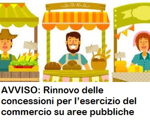 Con Determina n. 308/2021 è stato approvato l'avviso pubblico di avvio del procedimento di rinnovo delle concessioni per il commercio su area pubblica.Sono sottoposte a procedura di rinnovo le concessioni di aree pubbliche con scadenza al 31/12/2020 finalizzate all'esercizio di: