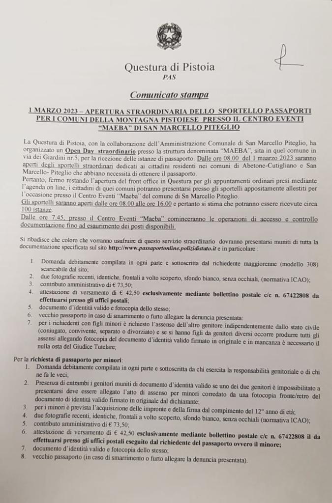 Si avvisano i signori utenti che a far data da MARTEDI' 28 MARZO P.V. SARA' POSSIBILE RITIRARE I PASSAPORTI la cui documentazione è stata predisposta il 1/3/2023.
