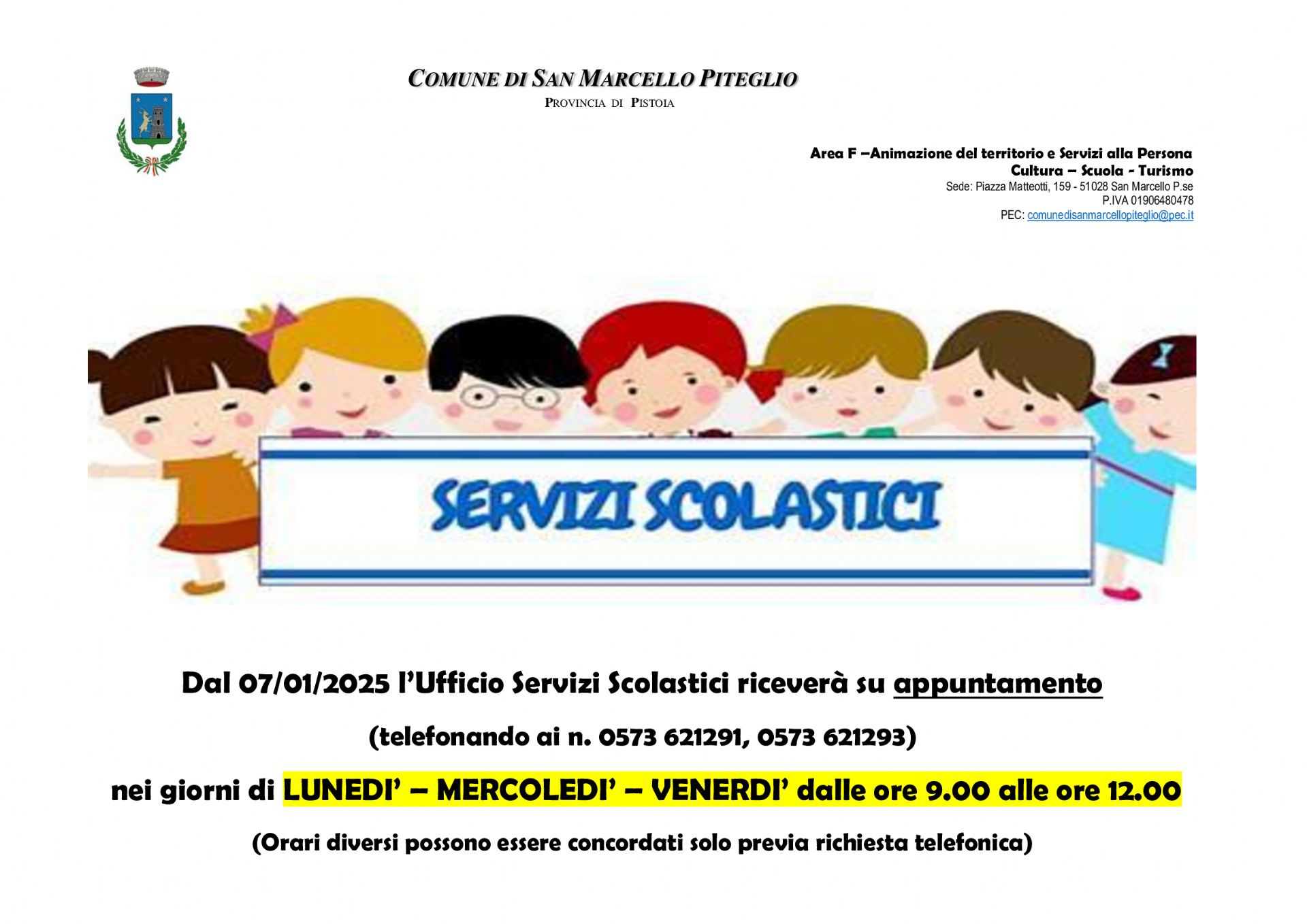 Dal 7 gennaio 2025 l'Ufficio Servizi Scolastici riceverà su appuntamento