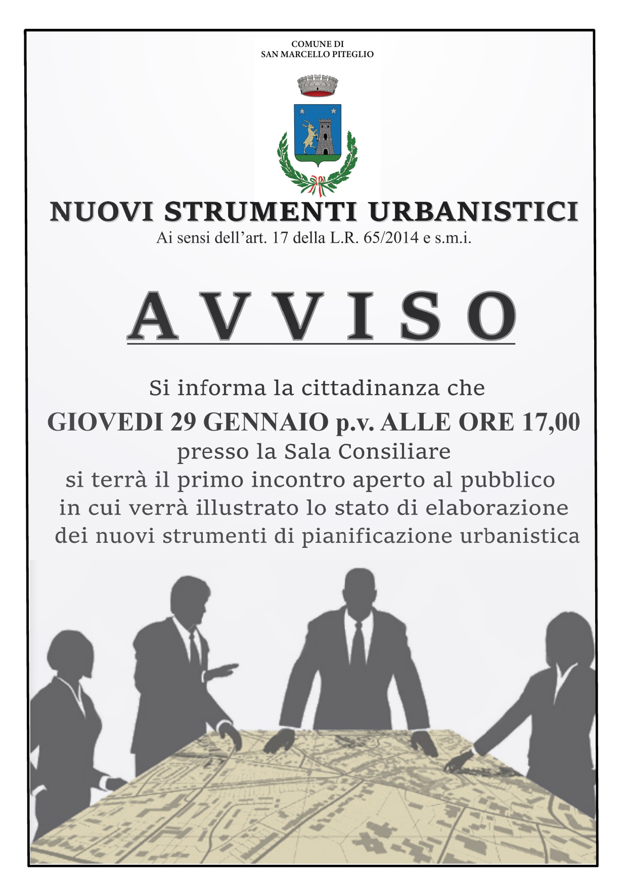 Si informa la cittadinanza che il giorno GIOVEDI 29 GENNAIO p.v. alle ore 17,00 presso la Sala Consiliare si terrà il primo incontro aperto al pubblico in cui verrà illustrato lo stato di elaborazione dei nuovi strumenti di pianificazione urbanistica
