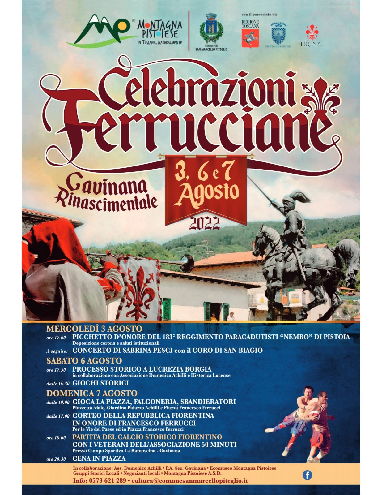 Programma degli eventi previsti per le Celebrazioni Ferrucciane 2022 per i giorni 3, 6 e 7 Agosto.